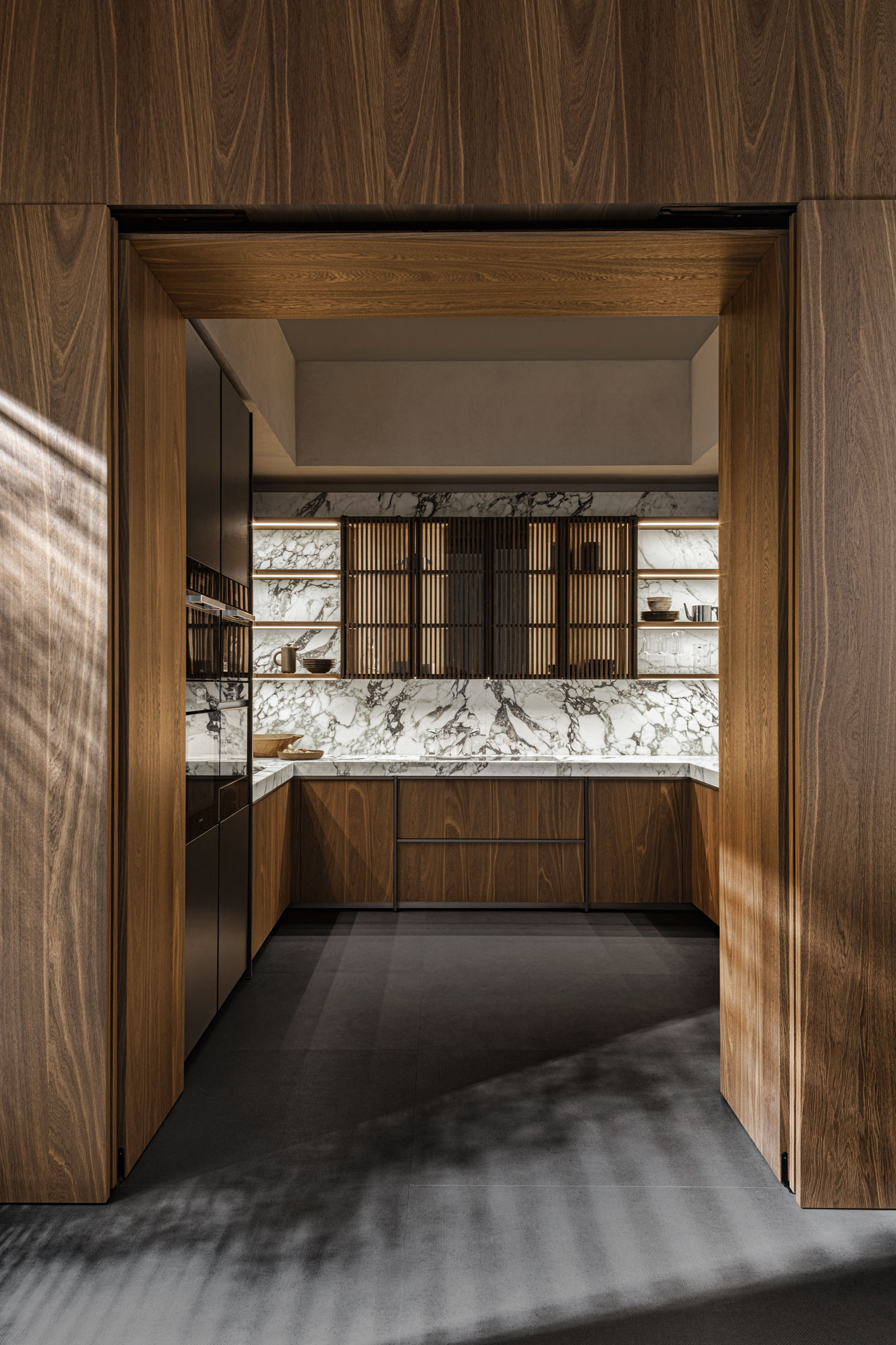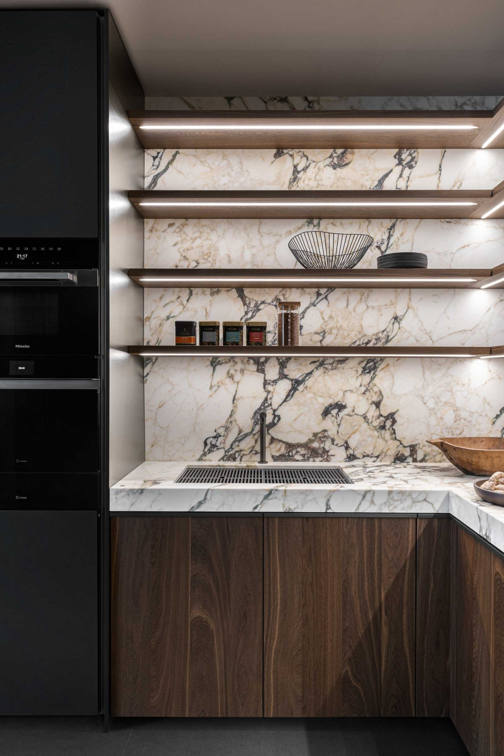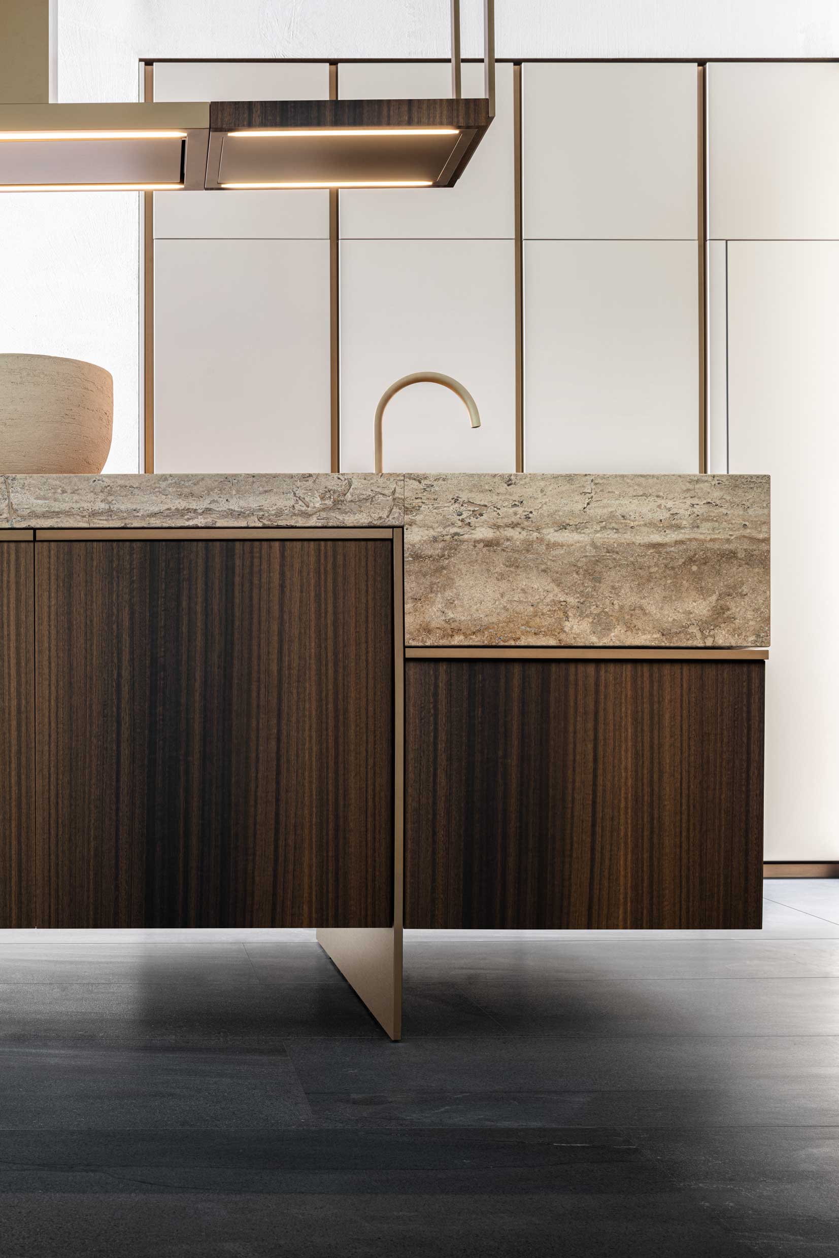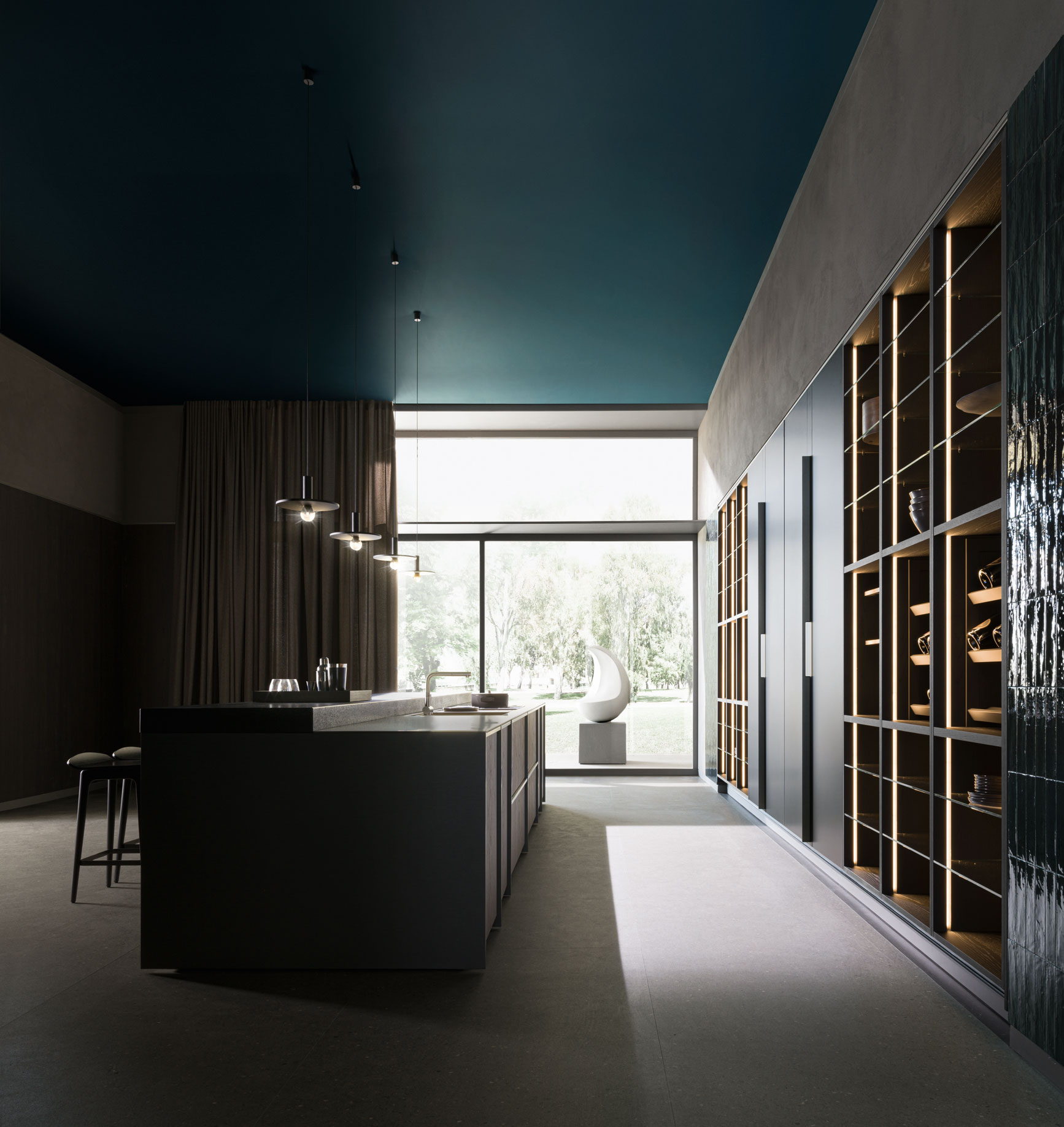 Metal grids define the basic architecture, wall units, columns, hoods and accessories. Full volumes, empty volumes and tops of different thicknesses are hooked to the slender and minimal techno/structural elements, creating an elegant interplay of balances.