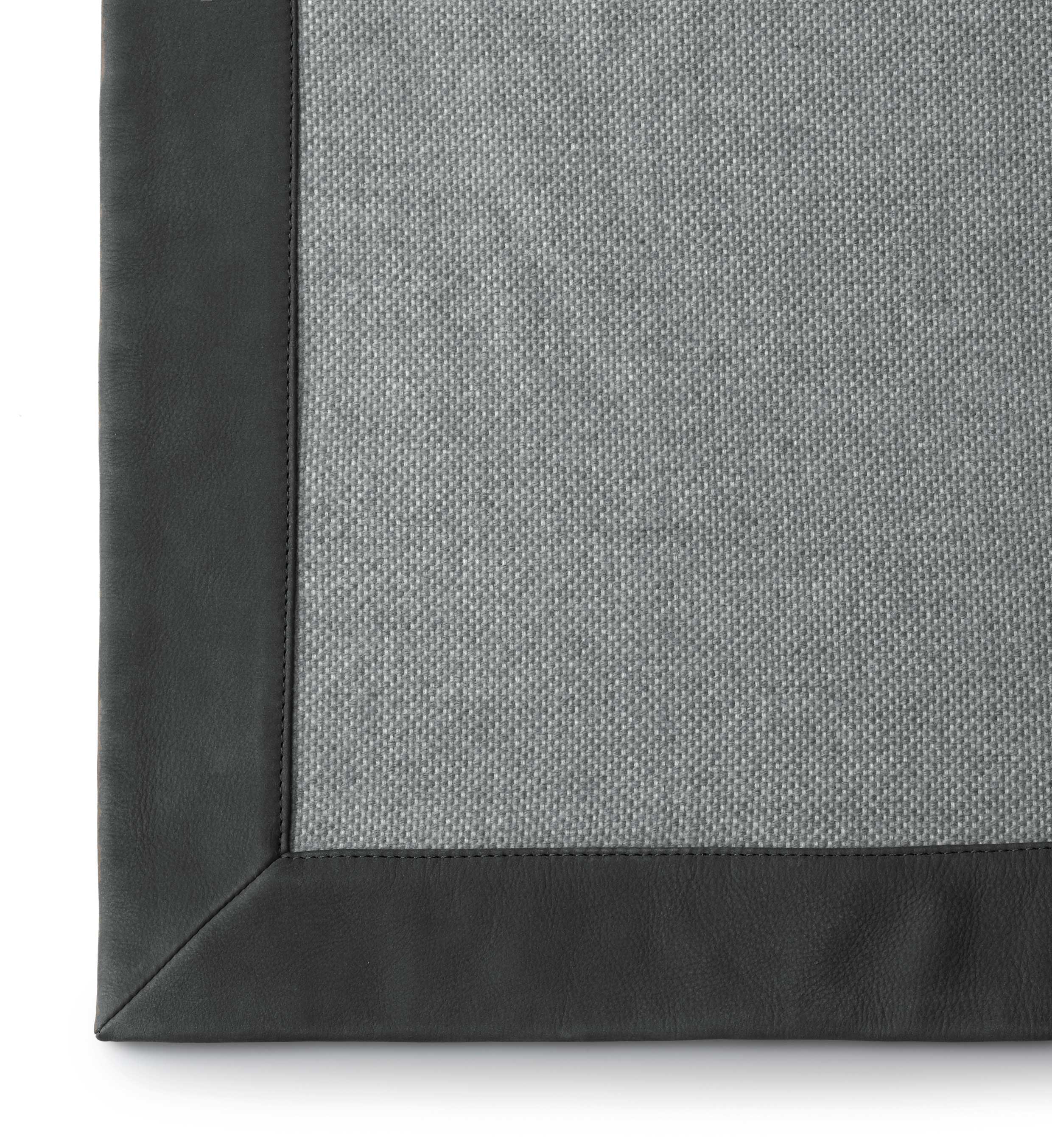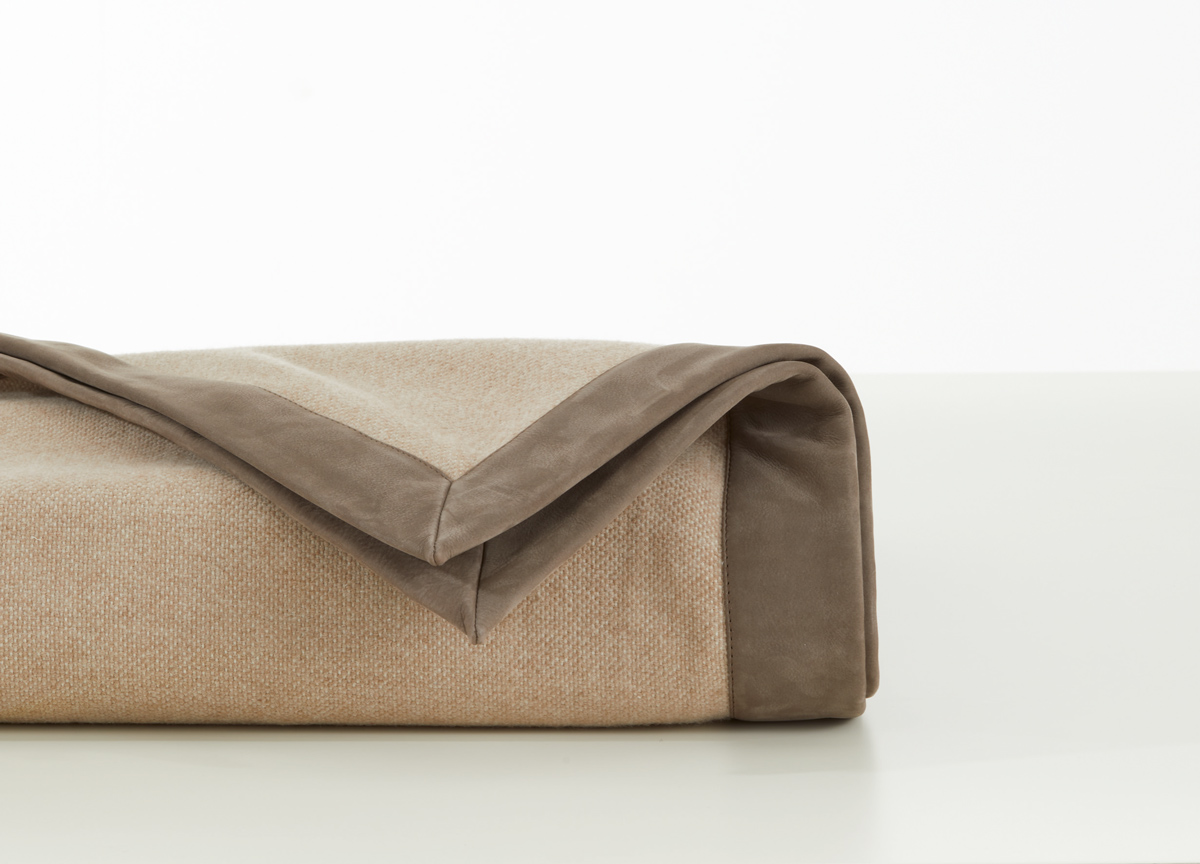 Blanket with a central part made of fine wool and a border made of nubuck leather. The border gives the product a formal tone while the finely woven wool makes it light and cosy. Warm dove grey/brown shades and elegant shades of grey for a timeless accessory that adapts to the colours of the seasons and furnishings.